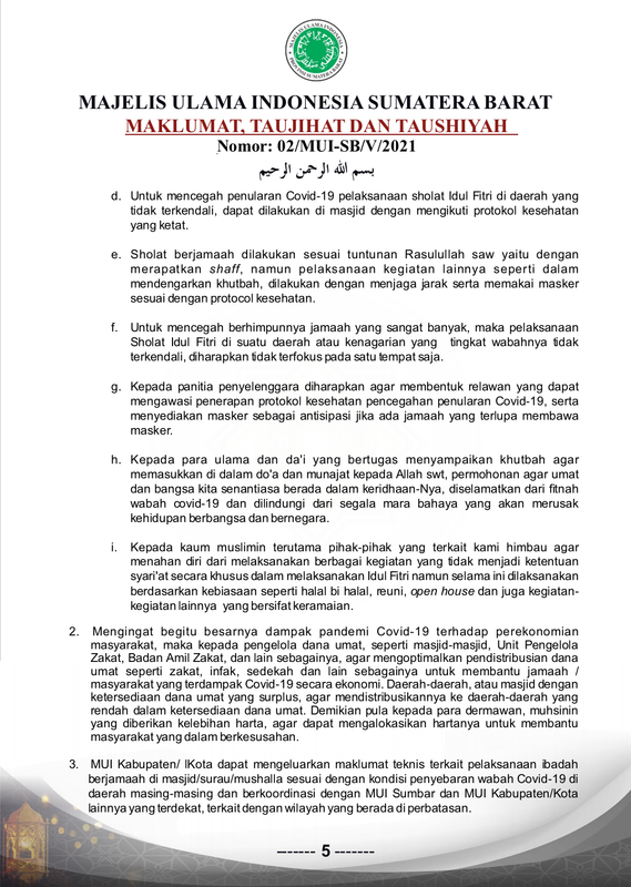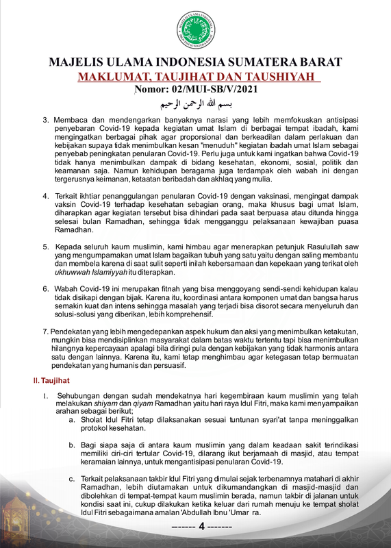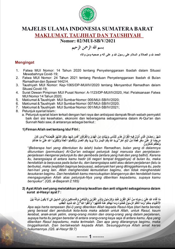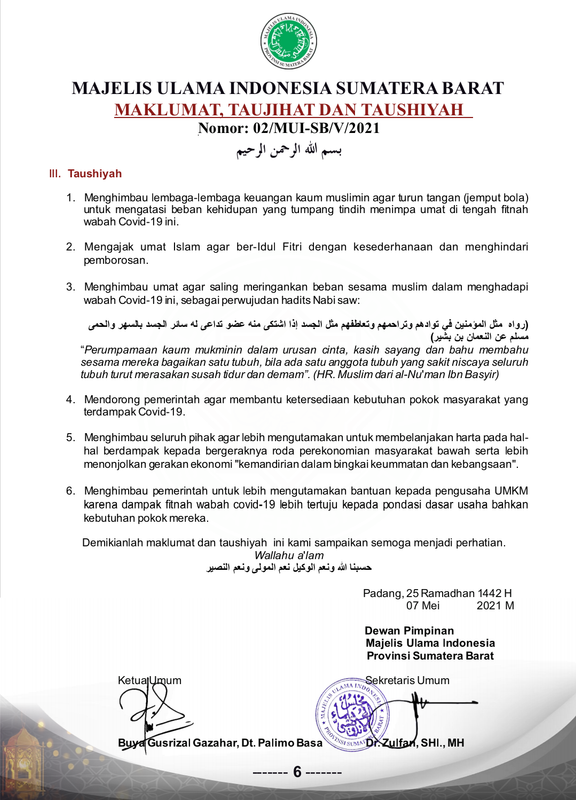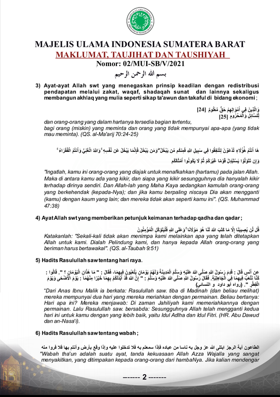 Inilah MAKLUMAT, TAUJIHAT DAN TAUSHIYAH MUI Sumbar Soal Pelaksanaan Idul Fitri
